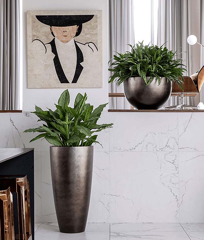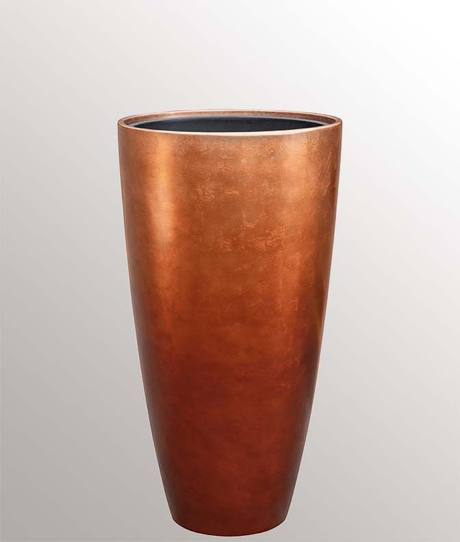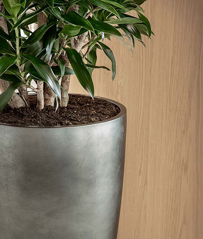 La collection Metallic a un look élégant et raffiné. C'est un pot solide car il est en composite. Le pot est léger et donc facile à déplacer. Le pot est entièrement recouvert de feuille d'argent. Au-dessus de cela se trouve une couche de laque colorée transparente. La jardinière est livrée avec une doublure imperméable amovible.