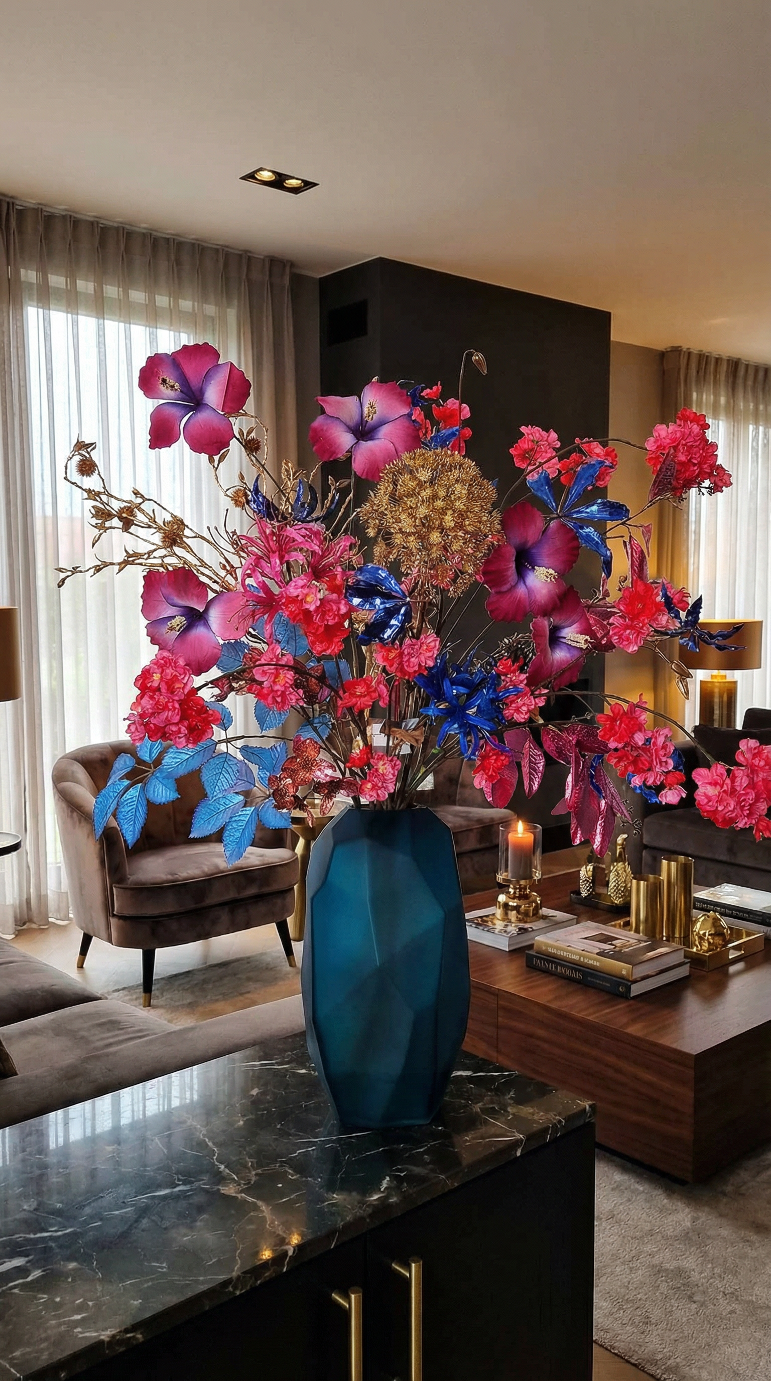 C'est un bouquet aux couleurs rose, bleu et or. Le bouquet se compose de 18 tiges comprenant fleur, nérine, rose, tournesol, magnolia, hibiscus, eremurus, heracleum gold, orchidée, branche d'eucalyptus bleu et rose, branche feuille d'or, gloriosa, dahlia, chardon et amaranthus.