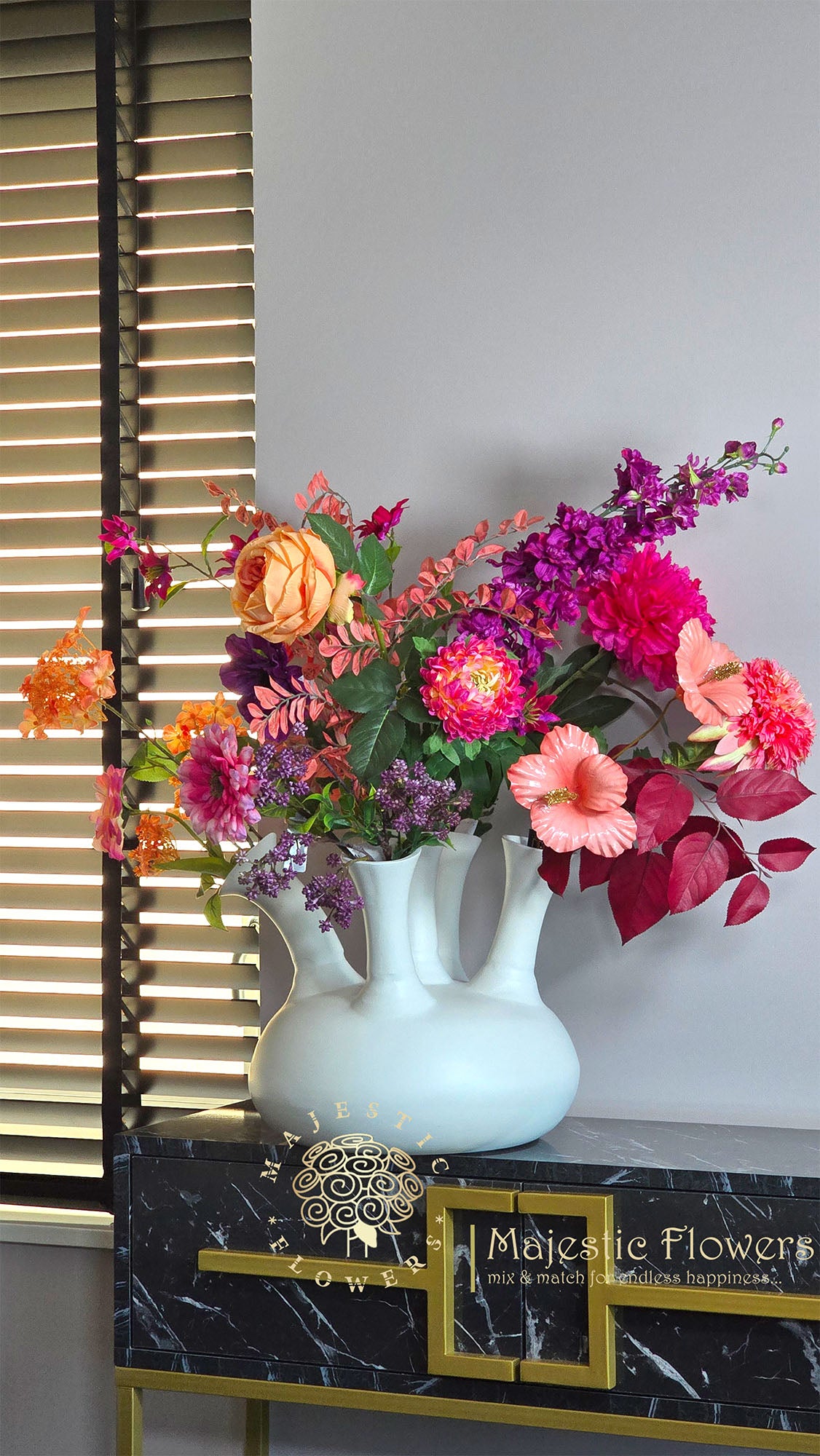 De combinatie van prachtige natuurlijke lichte kleuren zorgt ervoor dat dit kunstboeket een rustgevende uitstraling heeft. Een schitterend boeket dat in elk interieur past! Net als al onze andere boeketten is dit met zorg samengesteld en daardoor echt uniek. Combineer het boeket met één van onze andere vazen uit de collectie . Heb jij een eigen vaas? Neem dan contact met ons op.