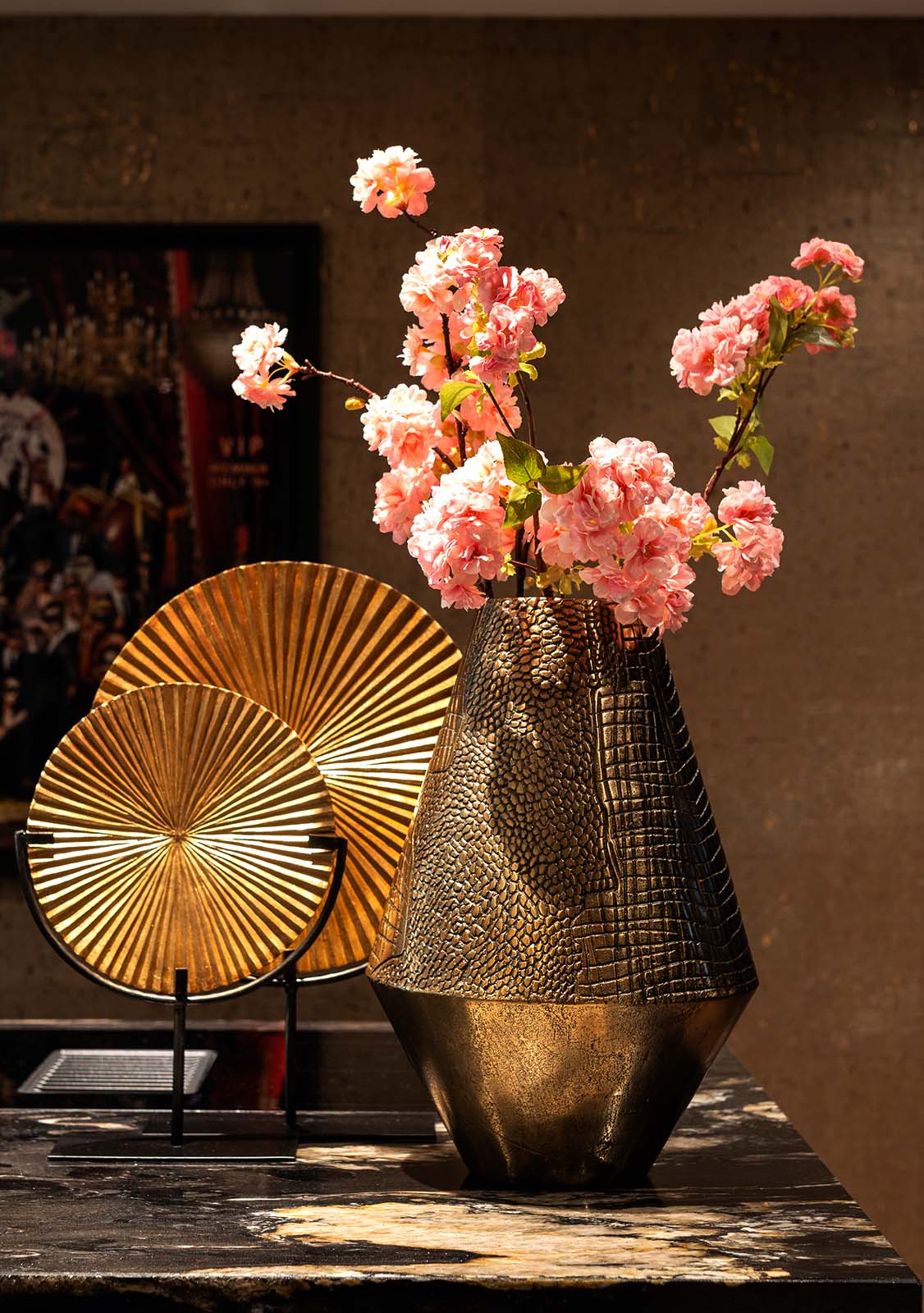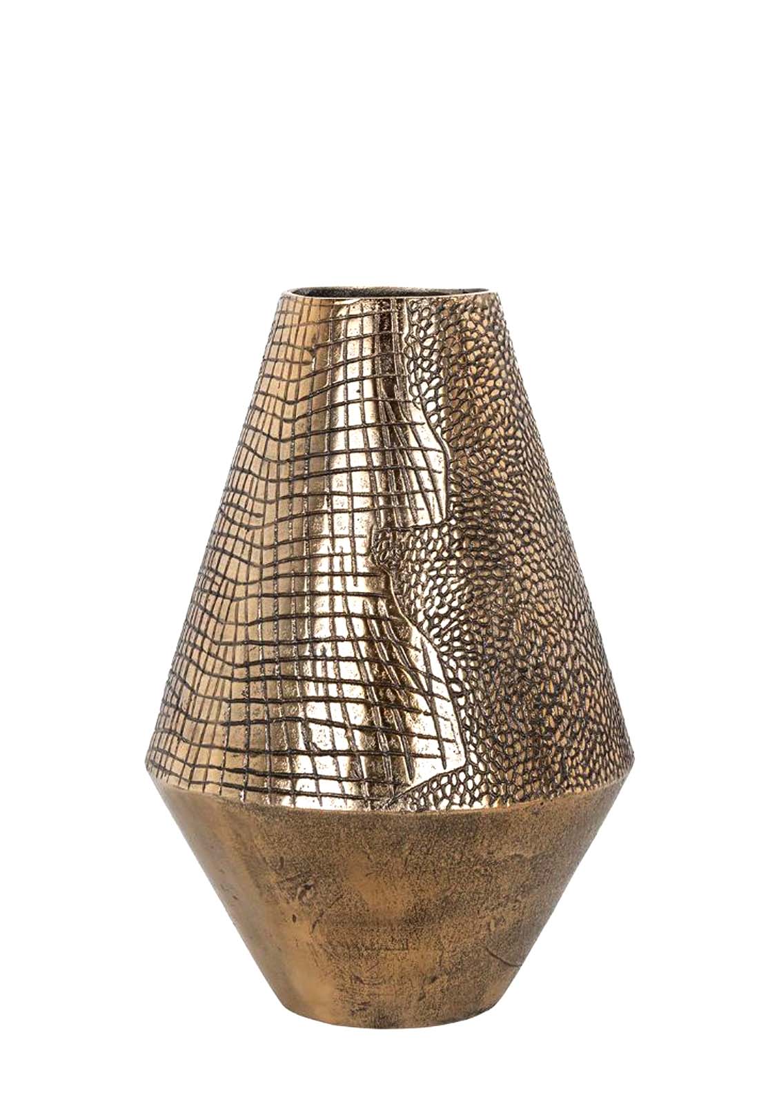De Richmond Vaas Danic is een prachtig en chique accessoire dat een vleugje luxe aan jouw interieur toevoegt. Deze unieke vaas, vervaardigd uit hoogwaardig aluminium, is een ware blikvanger, zowel met als zonder bloemen. De vaas is voorzien van een elegante croco look-a-like print en heeft een stijlvolle bronzen kleur die de aandacht trekt en een vleugje sophisticated glamour toevoegt aan elke ruimte. Er is ook een kleine variant van Vaas Danic.