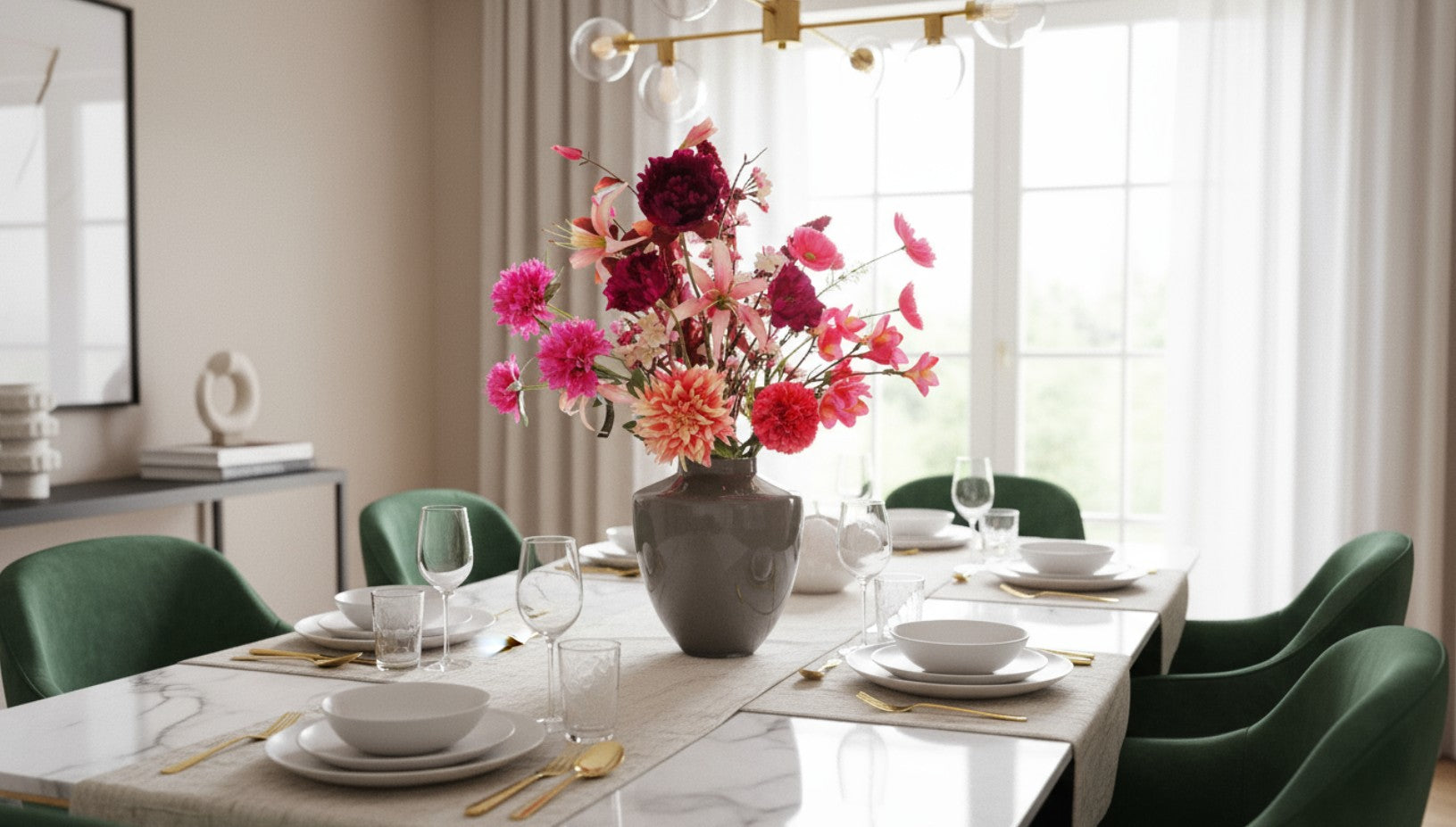 Dit schitterende zijdenbloemen boeket brengt leven en kleur in elke ruimte. De combinatie van levendige fuchsia, diep rode en zachte roze tinten straalt warmte en luxe uit. De dahlia’s, klaprozen, cosmos, bloesem en bessen tak in dit arrangement zijn zorgvuldig samengesteld voor een speelse, maar verfijnde uitstraling. Het boeket is opgemaakt in een glanzende bruine vaas, die het geheel een moderne en stijlvolle finishing touch geeft. Dit kleurrijke bloemstuk is ideaal voor wie op zoek is naar een opvallend element dat elke kamer opfleurt, van de woonkamer tot het kantoor.