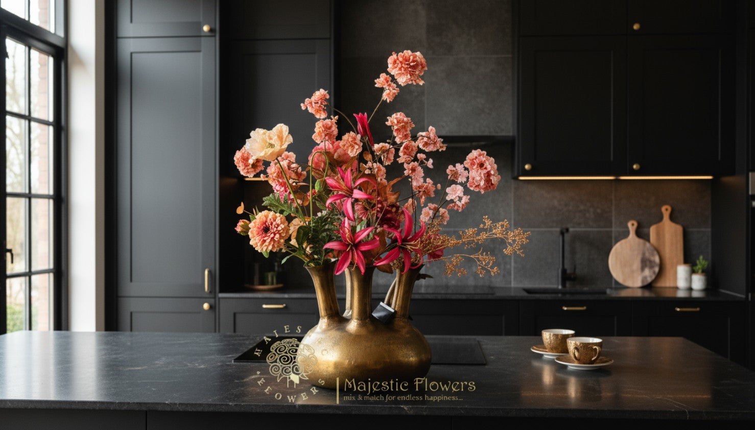De zijdenboeket "Magical beauty" is een verfijnde samenstelling van zorgvuldig geselecteerde zijden bloemen, gehuld in een prachtig palet van oud roze, fuchsia en gouden tinten. De warme tonen van roze en fuchsia vormen een gedurfde, doch harmonieuze combinatie.