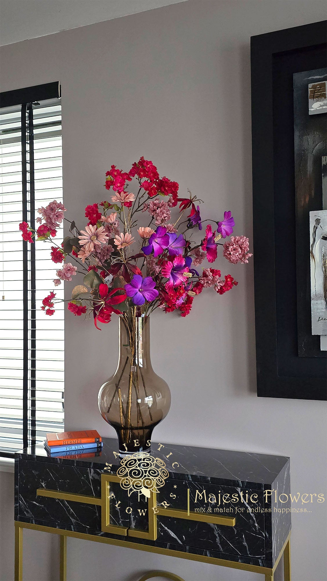 Breng een vleugje tijdloze elegantie in huis met dit prachtige zijdenbloemen boeket. Dit zorgvuldig samengestelde arrangement combineert fuchsia, violet en oud roze die samen een harmonieuze en levendige uitstraling creëren. Perfect gepresenteerd in een stijlvolle, moderne vaas, past dit boeket prachtig in zowel klassieke als moderne interieurs. Of het nu op een bijzettafel, dressoir of in de hal staat, dit kunstzinnige bloemenarrangement is een echte blikvanger die sfeer en luxe toevoegt aan elke ruimte.