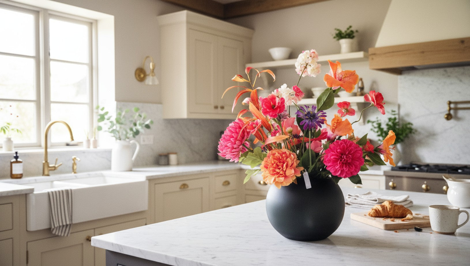 Dit schitterende zijdenbloemen boeket brengt leven en kleur in elke ruimte. Met een rijke variatie aan levendige bloemen in felle tinten van roze, oranje en paars vormt dit boeket een opvallend accent in elke ruimte. De bloemen zijn zorgvuldig samengesteld en geplaatst in een stijlvolle ronde zwarte vaas, die perfect contrasteert met de kleurrijke bloemen.