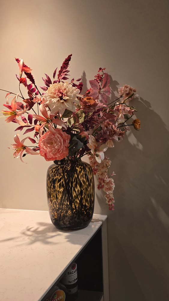 Het kunstboeket "Romantic Blush" is een unieke samenstelling van diverse zijdenbloemen in oud rose, licht roze en rode tinten. Door verschillende zijdenbloemen van dezelfde kleur maar in verschillende tinten met elkaar te combineren, ontstaat een prachtig harmonieus geheel.